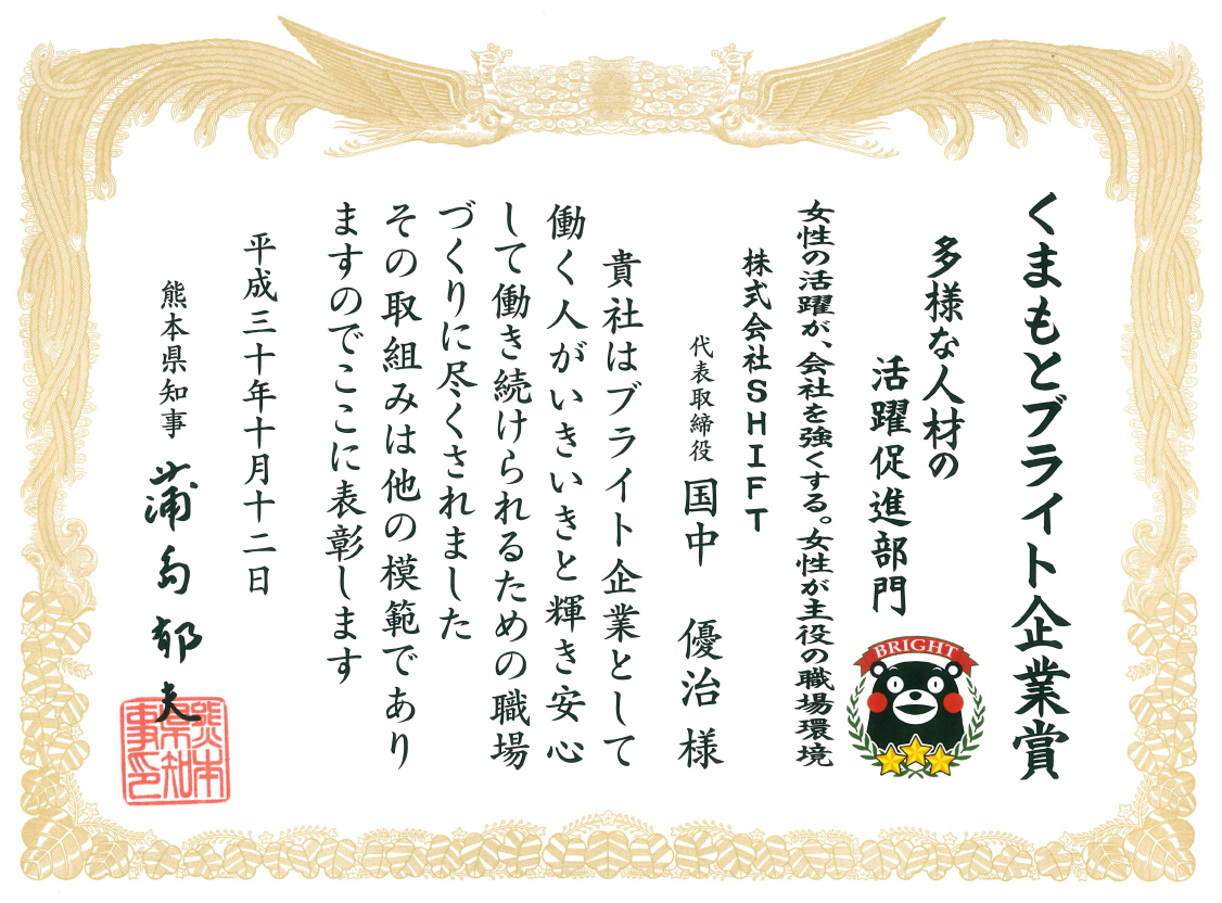 くまもとブライト企業賞賞状