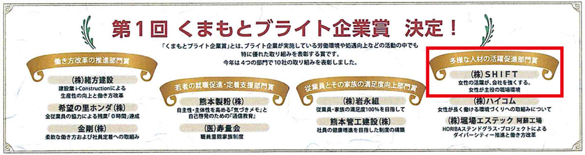 「くまもとブライト企業賞」とは、ブライト企業が実施している労働環境や処遇向上などの活動の中でも特に優れた取り組みを表彰する賞です。