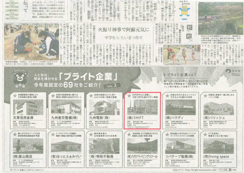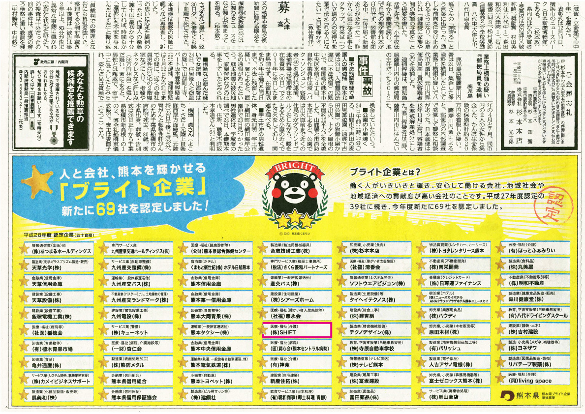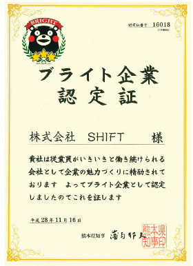 このたび株式会社SHIFTは、熊本県よりブライト企業認定証が交付されました。